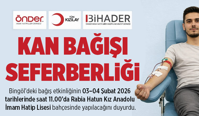ÖNDER İmam Hatipliler Derneği, Türk Kızılay iş birliğiyle 'İyilik Kanımızda Var' sloganıyla Türkiye genelinde kan bağışı kampanyası başlatırken, Bingöl'deki bağış etkinliğinin 03–04 Şubat 2026 tarihlerinde Rabia Hatun Kız Anadolu İmam Hatip Lisesi bahçesinde yapılacağını duyurdu.