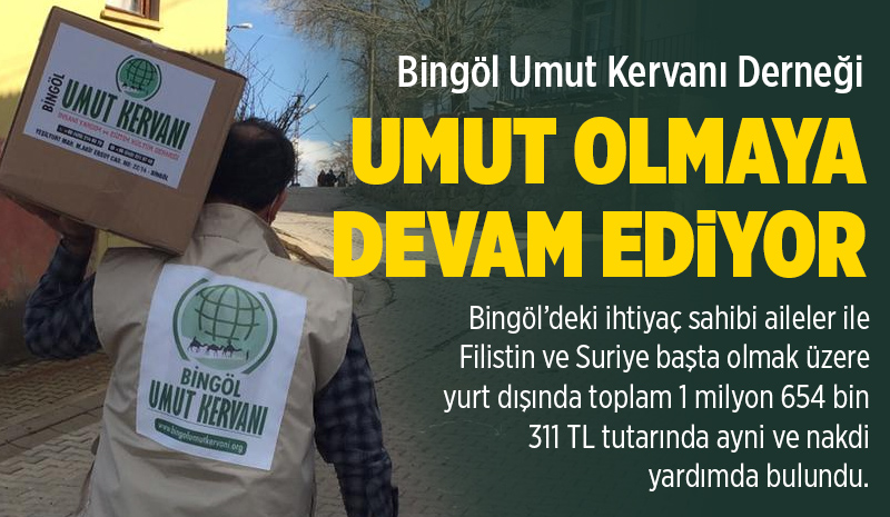 Bingöl Umut Kervanı Derneği, 2026 yılı Ocak ayında Bingöl'deki ihtiyaç sahibi aileler ile Filistin ve Suriye başta olmak üzere yurt dışında toplam 1 milyon 654 bin 311 TL tutarında ayni ve nakdi yardımda bulundu.