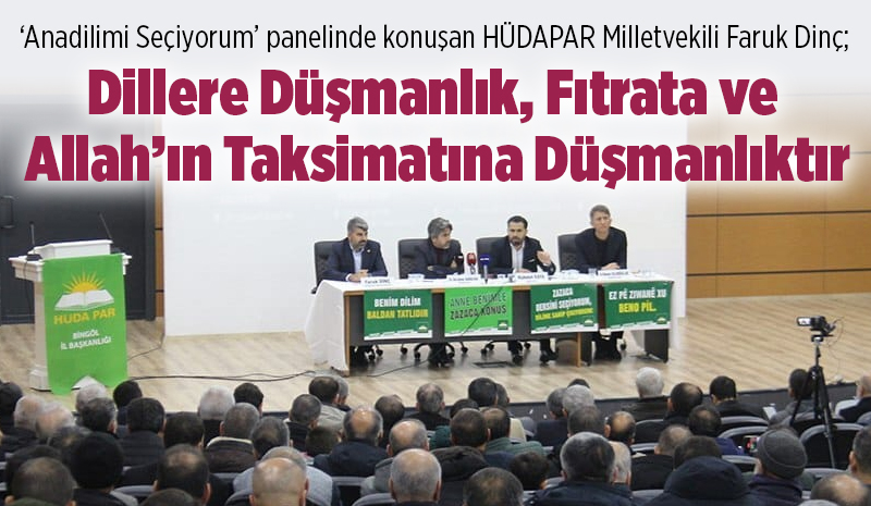 HÜDA PAR'ın Bingöl'de düzenlediği 'Anadilimi Seçiyorum' panelinde konuşan Mersin Milletvekili Faruk Dinç, dil çeşitliliğinin ilahi bir nimet olduğunu belirterek, dillere yönelik düşmanlığın fıtrata ve Allah'ın taksimatına karşı çıkmak anlamına geldiğini söyledi.