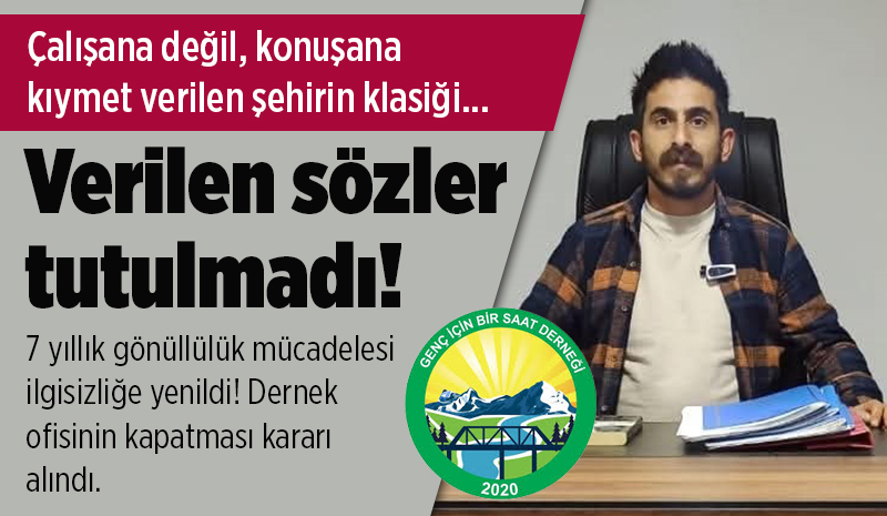 Bingöl'ü yaklaşık 7 yıldır sosyal sorumluluk alanında gönüllülük esasıyla temsil eden Genç İçin Bir Saat Derneği, yaşadığı maddi zorluklar ve verilen destek sözlerinin tutulmaması nedeniyle dernek ofisini kapatma kararı aldı. Dernek yönetimi, faaliyetlerin sona ermediğini ancak artık kira yükü olmadan konteyner alanında sürdürüleceğini duyurdu. |