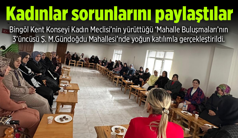 Bingöl Kent Konseyi Kadın Meclisi'nin yürüttüğü 'Mahalle Buluşmaları' programı kapsamında üçüncü toplantı Şehit Mustafa Gündoğdu Mahallesi'nde yoğun katılımla gerçekleştirildi. Kadınların talep ve önerileri yerinde dinlendi, çözüm yolları ortak akılla ele alındı. Raporlar, ilgili makamlara sunulacak. |