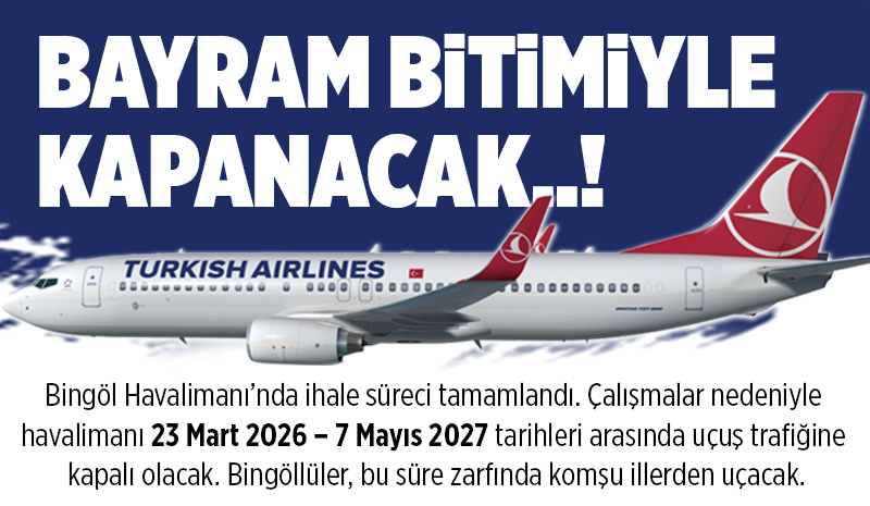 Pist, apron ve taksi yollarındaki bozulmalar nedeniyle onarıma alınacak Bingöl Havalimanı'nda ihale süreci tamamlandı. Çalışmalar nedeniyle havalimanı 23 Mart 2026 – 7 Mayıs 2027 tarihleri arasında uçuş trafiğine kapalı olacak. Bingöllüler, bu süre zarfında komşu illerden uçacak.