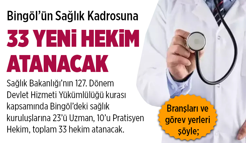 Sağlık Bakanlığı'nın 127. Dönem Devlet Hizmeti Yükümlülüğü kurası kapsamında Bingöl'deki sağlık kuruluşlarına toplam 33 hekim atanacak.