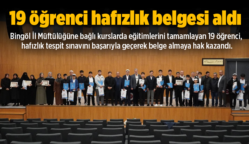 Bingöl İl Müftülüğüne bağlı kurslarda eğitimlerini tamamlayan 19 öğrenci, hafızlık tespit sınavını başarıyla geçerek belge almaya hak kazandı.
