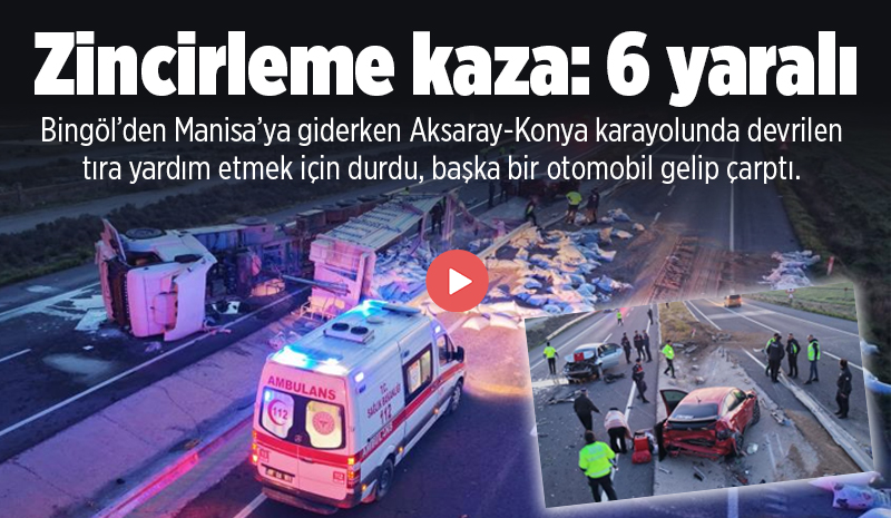 Bingöl'den Manisa'ya giderken Aksaray-Konya karayolunda devrilen tıra yardım etmek için durdu, başka bir otomobil gelip çarptı. Meydana gelen zincirleme kazada 6 kişi yaralandı. Yaralıların sağlık durumlarının iyi olduğu öğrenildi.