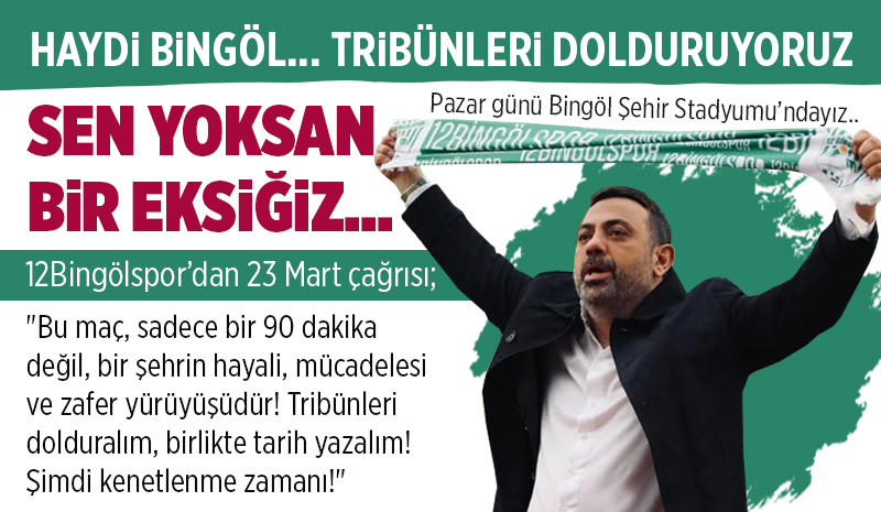 “Değerli Büyük 12 Bingölspor Taraftarı ve Kıymetli Hemşehrilerimiz; Şampiyonluk yolunda en kritik maçlarımızdan birine çıkıyoruz! Bu mücadelede sadece sahadaki 11 oyuncumuz değil, Bingöl'ün tamamı, ilçelerimiz, köylerimiz, hep birlikte kenetlenmeliyiz! Bu yüzden, Bitlis Özgüzeldere ile pazar günü saat 13.00'te oynayacağımız bu önemli maçta canlı yayın yapmayacağız. Çünkü bu mücadeleyi hep birlikte, omuz omuza, tribünden yaşamak istiyoruz! Yurtdışında yaşayan kıymetli hemşehrilerimiz, biliyoruz ki kalbiniz bizimle atıyor, bu maçı heyecanla takip etmek istiyorsunuz. Maalesef canlı yayın yapamayacağımız için bizlere kırılmamanızı diliyoruz. Ancak bilin ki, sahada ve tribünde her an sizleri yanımızda hissedeceğiz! Ve şimdi, Bingöl'ün dört bir yanına ve şehir dışındaki tüm hemşehrilerimize sesleniyoruz! Genç'in mert insanları, Solhan'ın inançlı yiğitleri, Karlıova'nın yürekli sevdalıları… Adaklı'nın vefalı dostları, Kiğı'nın dağ gibi vakur insanları, Yayladere'nin gönül adamları, Yedisu'nun su gibi temiz yürekli evlatları… Ve Bingöl Merkez ile tüm köylerimiz! Şehir dışında yaşayan tüm Bingöllüler! Bu maç, sadece bir 90 dakika değil, bir şehrin hayali, mücadelesi ve zafer yürüyüşüdür! Tribünleri dolduralım, birlikte tarih yazalım! Şimdi kenetlenme zamanı!”