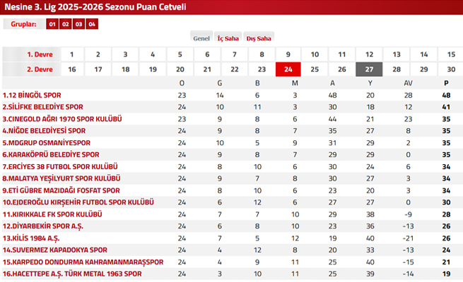 12Bingölspor'da alarm! Puan farkı 7'ye düştüTFF 3. Lig 2. Grup lideri 12 Bingölspor, son haftalarda yaşadığı puan kayıplarıyla dikkat çekiyor. Sahasında Erciyes 38 FK ile 1-1 berabere kalan Bingöl temsilcisinde galibiyet hasreti üç maça çıkarken, lider ile en yakın takipçisi arasındaki puan farkı 7'ye kadar geriledi. Yeşil beyazlı ekibin önündeki kritik karşılaşmalarda hata yapma lüksü yok!![]() TFF 3. Lig 2. Grup'ta liderliğini sürdüren 12 Bingölspor, ligin 24. haftasında Bingöl Şehir Stadyumu'nda Erciyes 38 FK ile karşılaştı. Mücadeleye golle başlayan taraf konuk ekip oldu. Erciyes 38 FK, 23. dakikada Mehmet Tosun'un golüyle 1-0 öne geçti. Golden sonra oyunun kontrolünü ele alan 12 Bingölspor, 36. dakikada kazandığı penaltıyı Berk Ali Nizam'ın gole çevirmesiyle skoru 1-1'e getirdi. Karşılaşmanın ikinci yarısında iki takım da gol bulamayınca mücadele 1-1 sona erdi. 3 Maçtır Galibiyet YokSon galibiyetini ligin 21. haftasında Kilis 1984 Spor karşısında 7-1'lik skorla alan 12 Bingölspor, son üç maçta 1 mağlubiyet ve 2 beraberlik alarak galibiyet hasretini üç maça çıkardı. Sezonun ikinci devresinde oynadığı 8 maçın 5'inde puan kaybı yaşayan Bingöl temsilcisi, bu süreçte 4 beraberlik ve 1 mağlubiyet aldı. Buna rağmen rakiplerinin de puan kaybetmesi nedeniyle 48 puanla liderliğini sürdürdü. İkincilik Yarışı KızıştıToplam 16 takımın mücadele ettiği 3. Lig 2. Grup'ta ikincilik yarışı oldukça çekişmeli geçiyor. 48 puanla lider durumda bulunan 12 Bingölspor'u 41 puanla Silifke Belediyespor takip ediyor. 35 puanlı Ağrıspor, Niğdespor, Osmaniyespor ve Karaköprüspor ile 34 puanlı Erciyes 38 FK, Malatya Yeşilyurtspor ve Mazıdağı Fosfatspor da üst sıralar için yarışını sürdürüyor. Taraftar TedirginSon haftalarda yaşanan puan kayıpları Bingölspor camiasında soru işaretlerini de beraberinde getirdi. Takımın rehavete mi girdiği yoksa performans olarak düşüş mü yaşadığı yönünde değerlendirmeler yapılırken, her geçen hafta kaybedilen puanlar taraftarları da tedirgin ediyor.