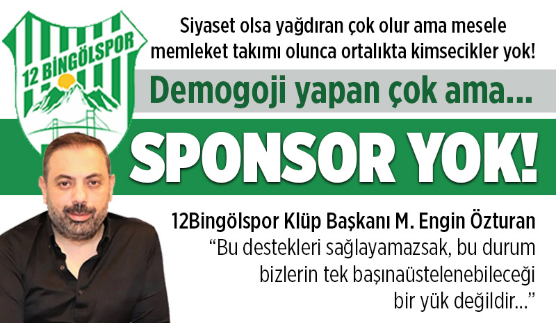 12Bingölspor'un yeni sezonda daha güçlü olabilmesi için yürütülen çalışmalardan beklenen sonucun alınamadığını ve sunulan desteklerin yetersiz olduğunu belirten 12Bingölspor Kulübü Başkanı M.Engin Özturan; “Ana sponsorumuzun, forma sponsorumuzun ve şanlı 12 Bingölspor'umuzun göğüs sponsorunun olmayışı bizleri derinden üzüyor. Bizler iki senedir kendi imkanlarımızla maddi olarak katkı sağladığımız takımımızı şampiyonluğa kadar yükselttik ama artık sizlere, bu yolda ihtiyacımız var” dedi.