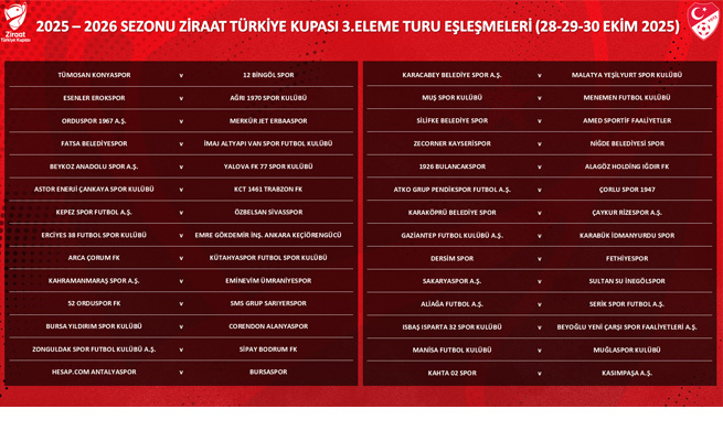 Kura çekimi; 2. turu geçen 39 takımın yanı sıra Trendyol Süper Lig'den 7, Trendyol 1. Lig'den 10 olmak üzere toplam 56 takımın katılımıyla gerçekleştirildi. 28 takımın seri başı olduğu eşleşmede küçük numarayı çeken takımlar müsabakaya ev sahipliği yapacak. Ziraat Türkiye Kupası'nda 3. Tur Eleme müsabakaları tek maç eleme usulüne göre 28, 29 ve 30 Ekim'de oynanacak.