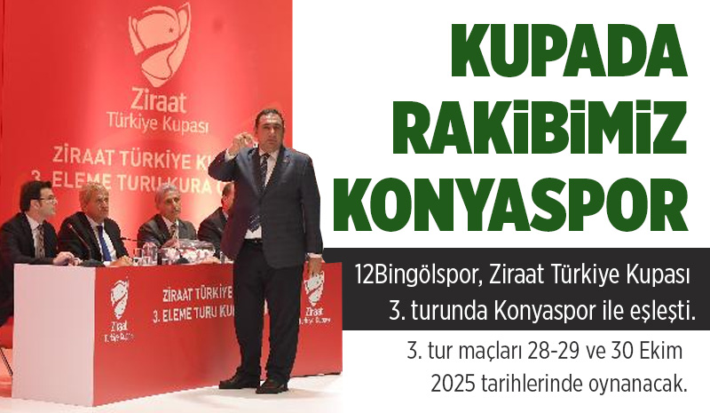Kura çekiminde 3. Lig temsilcimiz 12Bingölspor'un rakibi, süper ligde 10. Sırada yer alan Konyaspor oldu. Ligde namağlup olarak liderliğini sürdüren ve Ziraat Kupası birinci turunda 2. Lig ekiplerinden Ağrı'yı, ikinci turunda da yine 2. Lig ekiplerinden Elazığ'ı mağlup ederek yükselişini sürdüren yeşil beyazlı temsilcimiz 12Bingölspor, Konya karşısında da galibiyeti göğüsleyip kupa heyecanını devam ettirmek istiyor.