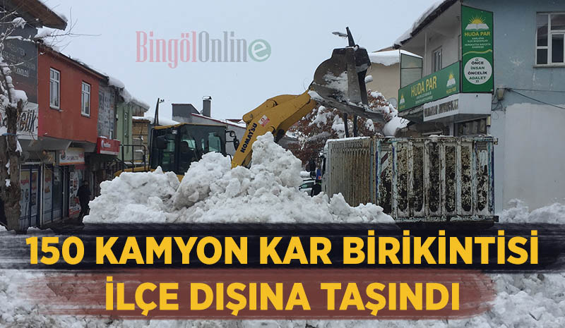 Bingöl'ün yüksek rakımlı ilçesi Karlıova'da karla mücadele çalışmaları hem İlçe Özel İdare hem de belediye ekiplerince aralıksız sürdürülüyor. Kar yağışının etkisini gösterdiği ilçede kar kalınlığı yer yer 1 metreyi aşarken, belediye ekipleri ana cadde ve sokaklarda karla mücadele ediyor. Yaklaşık 5 gündür kamyonlarla ilçe dışına kar taşıdıklarını belirten belediyede görevli kepçe operatörü Mücahit Özyıldırım, şu ana kadar 150 kamyon kar birikintisi taşıdıklarını aktardı.