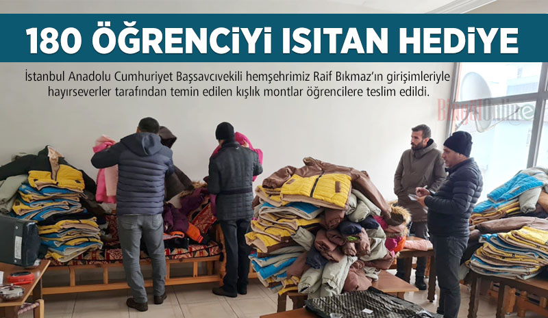 180 öğrenciyi ısıtan hediyeHediyeler, Melekân Köy Derneği tarafından organize edilip dağıtıldı.![]() İstanbul Anadolu Cumhuriyet Başsavcı Vekili hemşehrimiz Raif Bıkmaz'ın girişimleriyle hayırsever iş insanlarınca temin edilen 180 adet kışlık mont, Bingöl'de yetim öğrenciler başta olmak üzere ihtiyaç sahiplerine dağıtıldı. 180 adet monttan 30'unun Merkez Borsa İstanbul Sarayiçi İlkokulu'nda okuyan yetim öğrencilere, 150'sinin de Bıkmaz'ın köyü olan ve ilkokulu okuduğu Mutluca (Melakan) Köyü'ndeki öğrencilere dağıtıldı. Dağıtımın Melekân Köy Derneği tarafından organize edildiği bildirildi.
