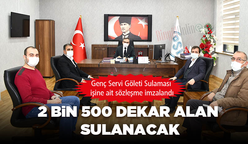 DSİ 9. Bölge Müdürlüğü'nden yapılan açıklamada; “Bingöl Genç Servi Göleti Sulaması İnşaatı işine ait sözleşme, 10.12.2020 tarihinde DSİ 9. Bölge Müdür Vekili Dr. Ercan GERÇEK ile yüklenici Turkay Yapı İnş. Nak. Hafr. Gıda Turz. Enj. San. ve Tic. A. Ş. arasında imzalandı. Ön yüzü membran kaplı kaya dolgu tipinde yapımı tamamlanmış olan Bingöl Genç Servi Göleti, temelden 42 metre yükseklikte ve 1,10 milyon metreküp su biriktirme hacmine sahiptir. Bingöl Genç Servi Göleti Sulaması işine ait sözleşme kapsamında; 2.500 dekar tarım arazisinin cazibeli basınçlı borulu sulama sistemiyle sulanması sağlanacaktır” denildi.