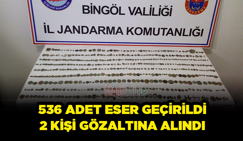 Alanın bilgiye göre, İl Jandarma Komutanlığı'na bağlı birimler tarihi eser kaçakçılığı ile ilgili yaptığı çalışmada Solhan ilçesinde 2 şahsı tespit etti. Şahısların ellerinde bulunan tarihi eserleri piyasaya sürme planını öğrenen Jandarma Kaçakçılık ve Organize Suçlarla Mücadele (KOM) Şube Müdürlüğü ekipleri, İlçe Jandarma Komutanlığı'nın desteğiyle operasyon yaptı. Operasyonda 2 şüpheli yakalandı yapılan aramada ise 497 sikke, 11 adet takı objesi, 15 adet yüzük, 6 adet haç ve 7 adet mühür olmak üzere toplamda 536 adet tarihi eser ele geçirildi.