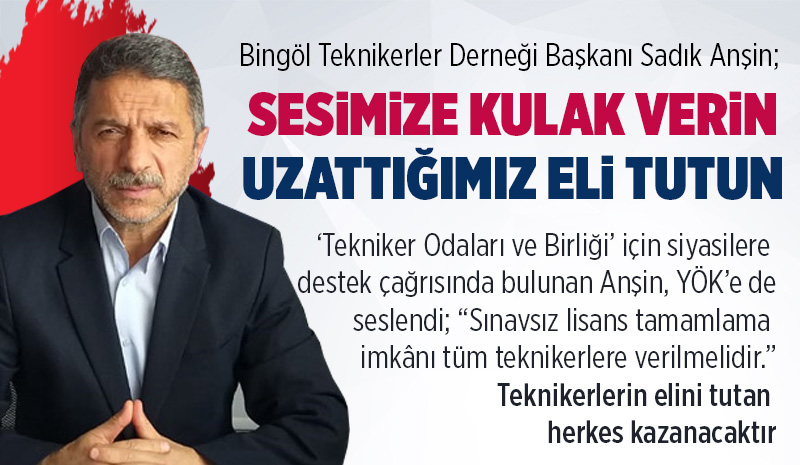 Bingöl Teknikerler Derneği Yönetim Kurulu Başkanı Sadık Anşin, 5 Nisan Teknikerler Günü dolayısıyla kapsamlı bir açıklamada bulundu. Teknikerlerin sorunlarını sıraladığı açıklamasında YÖK'e çağrıda bulunan Anşin, sınavsız lisans tamamlama imkânının tüm teknikerlere verilmesi gerektiğini vurgularken, kamudaki teknikerlerin beklentilerine de dikkat çekti.