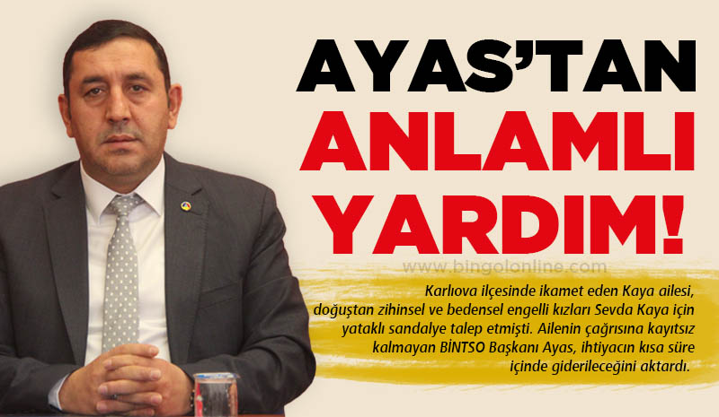 BİNTSO Başkanı Ayas, Karlıova'da ikamet eden Kaya ailesinin kızları için yataklı sandalye talebine karşılık vererek, kız çocuğu Sevda Kaya'nın yatağını aldı. Ayas, Elektrikli katlanabilir özellikli (hastane yatağı), Çarşamba günü aileye teslim edileceğini bildirdi.