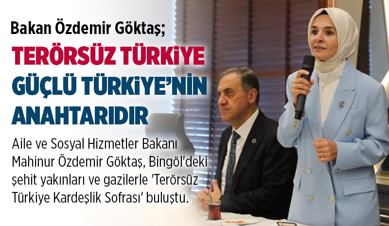 Aile ve Sosyal Hizmetler Bakanı Mahinur Özdemir Göktaş, bir dizi program için bulunduğu Bingöl'de şehit yakınları, gaziler ve STK temsilcileriyle 'Terörsüz Türkiye Kardeşlik Sofrası'nda bir araya geldi. Ailelerle yakından ilgilenen Göktaş, sohbet ederek onların taleplerini dinledi.