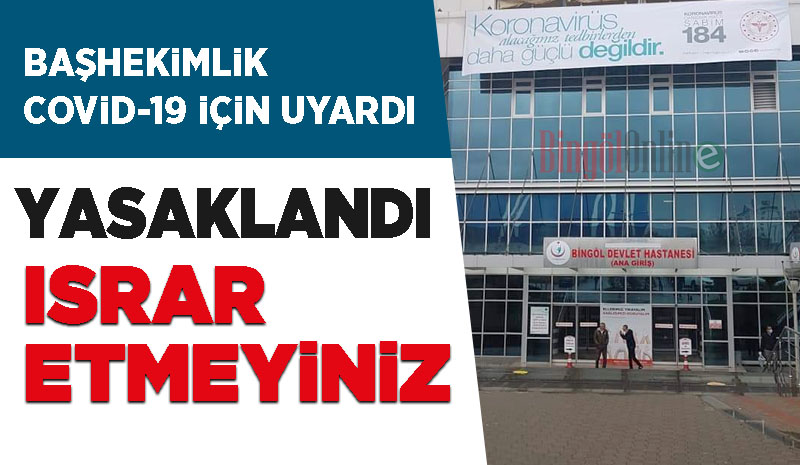 “Bildiğiniz üzere, sağlık neferleri olarak 1 yılı aşkın bir süredir COVİD-19 pandemisi ile mücadelemizi aralıksız olarak sürdürmekteyiz. Sizlerin bu süreçte önemli katkıları ve destekleri ile geçtiğimiz ay Bingöl ili olarak en az riskli iller arasına girdik ve vaka sayısında çok iyi bir noktaya ulaştık. Ne yazık ki, bu başarımız bizleri tedbirlere daha sıkı sarılmak yerine rehavete yönlendirdi. Bunun sonucu olarak da riskli iller kategorisi olan turuncu kategoriye geçtik. İlimiz artık daha riskli. Bu süreçte sizlerden tüm tedbirlere uymanızın yanı sıra hasta ziyareti yasaklarına da uymanızı önemle rica ediyoruz. Hasta ziyareti yasak olmasına rağmen ziyarette ısrar etmeniz çalışanlarımızın işlerine yoğunlaşmasını engellemekte ve hastalarınızın daha sağlıklı hizmet almasına mani olmaktadır. Bir kez daha değerli Bingöl halkından duyarlı olmalarını istirham ediyoruz.”
