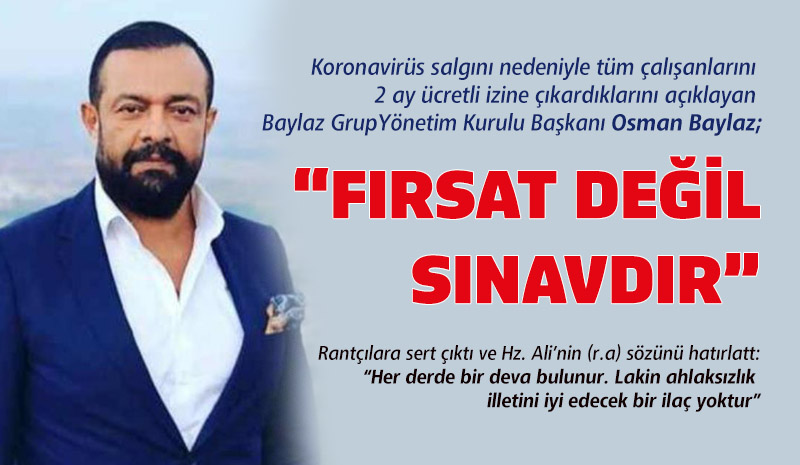 Koronavirüs (COVID-19) salgını karşısında tüm işverenlerin çalışanlarını koruması, haksızlığa maruz bırakmaması ve mağdur etmemesini isteyen Osman Baylaz: “Ülke genelinde koronavirüs salgınını fırsata çevirmek isteyenlerin yanı sıra çalışanlarını ücretsiz veya yıllık izine zorlayan işverenler olduğunu basın yoluyla takip ediyoruz. Bu zor günlerde çalışanları hiçbir ücret ödemeden izine çıkarmak onlara karşı yapılacak olan en büyük haksızlıktır. Biz çalışma arkadaşlarımızla güzel günleri paylaştığımız gibi zor günleri de beraber atlatmanın daha hayırlı olduğunu düşünüyoruz ve tüm işverenlerin de bu duyarlılıkla hareket etmelerini istiyoruz. Biliyoruz ki, bu bir fırsat değil, sınavdır. Herkesin sınavı başarıyla vermesini diliyoruz.” diye konuştu.