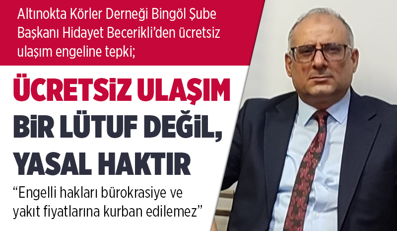 Bingöl'de toplu taşıma kooperatifleri ile kurumlar arasında yaşanan 'yakıt desteği' tartışmalarına Altınokta Körler Derneği tepki gösterdi. Dernek Başkanı Hidayet Becerikli, engelli bireylerin ücretsiz ulaşım hakkının durdurulmasına yönelik açıklamaların kabul edilemez olduğunu belirtti.