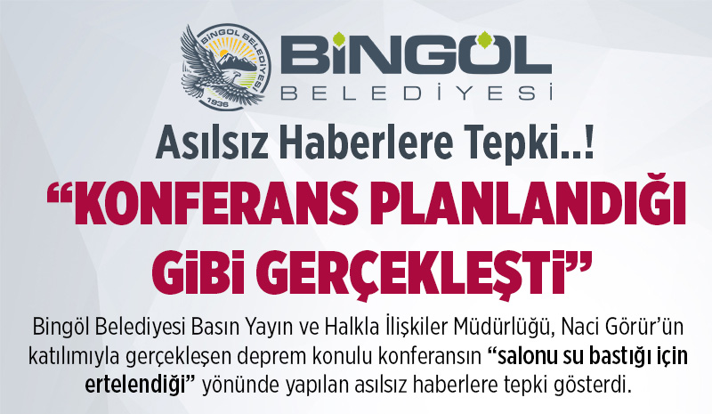 Bingöl Belediyesi Basın Yayın ve Halkla İlişkiler Müdürlüğü, 4 Nisan Cumartesi günü Prof. Dr. Naci Görür'ün katılımıyla gerçekleşen deprem konulu konferansın, bazı basın kuruluşları tarafından “salonu su bastığı için ertelendiği” yönünde yapılan asılsız haberlere tepki gösterdi.
