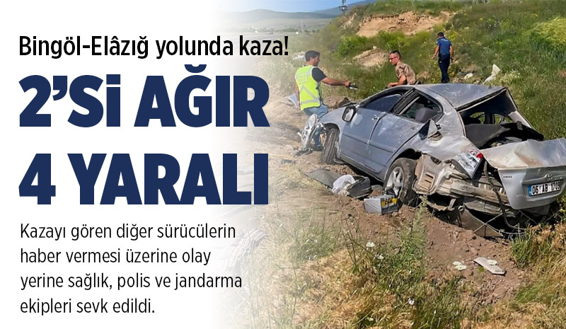 | Bingöl-Elâzığ yolunda kaza! 2'si ağır 4 yaralıKazayı gören diğer sürücülerin haber vermesi üzerine olay yerine sağlık, polis ve jandarma ekipleri sevk edildi. Kaza, Bingöl-Elazığ karayolu Yolçatı mevkiinde meydana geldi. Edinilen bilgiye göre, sürücüsü öğrenilemeyen 06 AB 1709 plakalı otomobil, sürücüsünün direksiyon hakimiyetini kaybetmesi sonucu şarampole uçtu. Kazada otomobilde bulunan 2'si ağır olmak üzere toplamda 4 kişi yaralandı. Kazayı gören diğer sürücülerin haber vermesi üzerine olay yerine sağlık, polis ve jandarma ekipleri sevk edildi. Yaralılar, olay yerinde yapılan ilk müdahalelerin ardından ambulanslarla hastanelere kaldırılarak tedavi altına alındı.