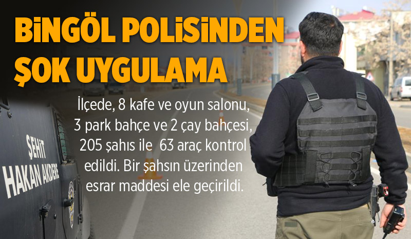 Bingöl polisinden şok uygulamaBingöl'ün Genç ilçesinde işyerlerine yönelik polis ekiplerince düzenlenen şok uygulamasında bir şahsın üzerinden esrar maddesi ele geçirildi.![]() Genç İlçe Emniyet Müdürlüğü sorumluluk sahasında takviye ekipleriyle şok uygulama gerçekleştirildi. İlçe merkezinde bulunan cadde, sokak, umuma açık mekân ve metruk binalarda sabit ve seyir halinde yapılan Genç huzur uygulaması neticesinde 8 kafe ve oyun salonu, 3 park bahçe ve 2 çay bahçesi, 205 şahıs 63 araç kontrol edildi. Bir şahıs üzerinden 5,40 gram esrar maddesi ele geçirildi. İlçelerde uygulamaların süreceği kaydedildi.