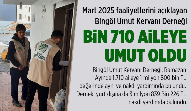 | Bingöl Umut Kervanı Bin 710 aileye umut olduMart 2025 faaliyetlerini açıklayan Bingöl Umut Kervanı Derneği, Ramazan Ayında 1.710 aileye 1 milyon 800 bin TL değerinde ayni ve nakdi yardımında bulundu. Yardım derneği ayrıca Filistin, Suriye ve Yemen başta olmak üzere yurt dışına 3 milyon 839 bin 226 TL nakdi yardımda bulundu. Türkiye'de ve dünyanın birçok yerinde yaptığı yardımlarla zengin ve fakir arasında hayır köprüsü vazifesi üstlenen Umut Kervanı Vakfı, Ramazan ayında birçok hayırlı faaliyete imza attı. Umut Kervanı Vakfı, yaptığı çeşitli yardımlarla binlerce ailenin ihtiyacını karşıladı. Yaptığı hayırlı hizmetlerle adını duyuran Umut Kervanı Vakfı Üyesi Bingöl Umut Kervanı İnsani Yardım ve Eğitim Kültür Derneği (Bingöl Umut Kervanı Derneği), 2025 yılı Mart Ayına ait faaliyet raporunu kamuoyuyla paylaştı. 5 MİLYON 639 BİN 226 TL YARDIM YAPILDIYapılan çalışmalarla ilgili gazetecilere açıklamalarda bulunan Bingöl Umut Kervanı Derneği Başkanı Mehmet Refik Gönül, “2025 yılı Mart Ayı'nda; 285 aileye 58 bin 460 TL değerinde beyaz et yardımı, 55 aileye 61 Bin100 TL değerinde kırmızı et yardımı, 6 aileye 60 Bin 930 TL değerinde ev eşyası yardımı, 1103 aileye 1 milyon 100 bin 943 TL değerinde gıda yardımı, 3 aileye 15 bin 150 TL değerinde giyim yardımı, 79 aileye 13 bin 500 TL değerinde Kuran-ı Kerim hediyesi, 179 aileye 489 bin 930 TL değerinde nakit yardımı olmak üzere toplamda 1.710 aileye 1 milyon 800 bin TL değerinde ayni ve nakdi yardım yapıldı. Ayrıca yurtdışı faaliyetlerimiz kapsamında Filistin (Gazze) başta olmak üzere Suriye, Afganistan, Yemen ve Afrika kıtasına 3 milyon 839 bin 226 TL nakdi yardımda bulunduk. Genel toplamda 5 milyon 639 bin 226 TL değerinde yurt içi ve yurt dışı yardımlarımızı ulaştırdık” dedi.