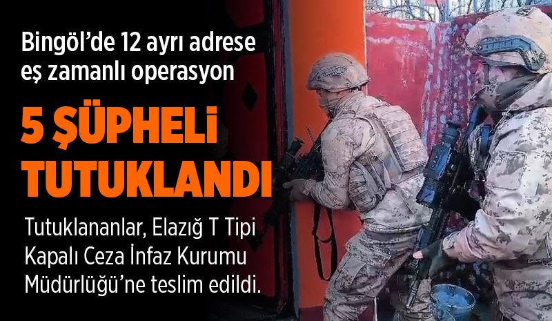 Bingöl İl Jandarma Komutanlığı ekipleri, ‘Suç İşlemek Amacıyla Örgüt Kurmak ve Uyuşturucu Madde İmal ve Ticareti' suçunu işleyen şüphelilerin yakalanmasına yönelik 25 Şubat 2025 tarihinde il merkezinde 12 ayrı adrese eş zamanlı operasyon düzenledi. Operasyonlarda 7 şüpheli şahıs yakalanarak gözaltına alındı. Soruşturma işlemleri tamamlanan şüpheli şahıslardan 2'si Cumhuriyet Savcısının talimatları doğrultusunda serbest bırakılırken, 5 şüpheli ise tutuklanarak Elazığ T Tipi Kapalı Ceza İnfaz Kurumu Müdürlüğü'ne teslim edildi.