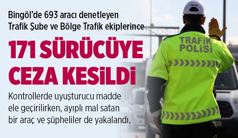 Bingöl İl Emniyet Müdürlüğü şehir içi ve bölge trafik ekiplerince 693 araç ve sürücü denetlendi. Denetimlerde kurallara uymayan 171 araç ve sürücüye trafik idari yaptırım cezası uygulandı. Ayrıca Narkotik Suçlarla Mücadele Şube Müdürlüğü Genç Büro Amirliği ekipleri tarafından yapılan çalışmalarda 1,36 gram top esrar maddesi ele geçirilirken 2 şüpheli hakkında adli işlem yapıldığı bildirildi.