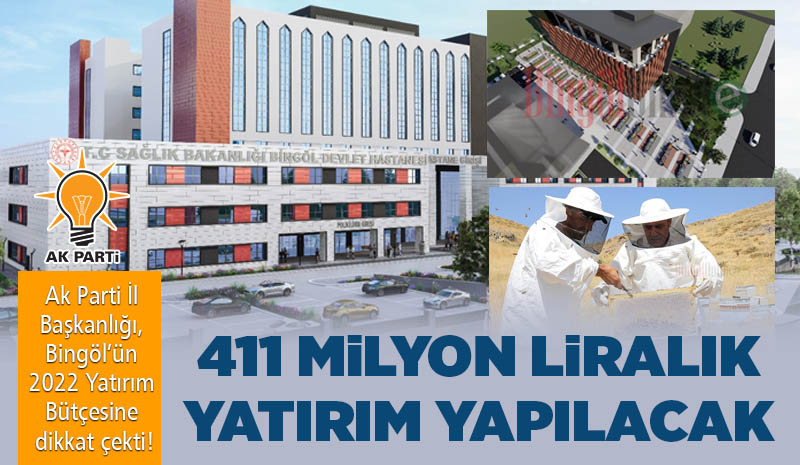 2022 Yılı Yatırım Programı Cumhurbaşkanı Kararı ile Resmi Gazete'de yayımlandı. Buna ilişkin değerlendirmelerini basın duyurusuyla paylaşan AK Parti Bingöl İl Başkanlığı, 2022 yatırım bütçesinin 411 milyon 869 Bin TL'ye yükseldiğini aktarup yatırım detaylarını paylaştı.