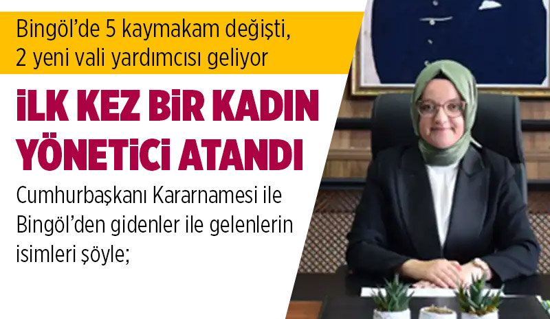 | Bingöl'de 5 kaymakam değişti, 2 vali yardımcısı geliyorCumhurbaşkanı Kararnamesi ile Bingöl'ün 5 ilçesinin kaymakamı değişti, 2 yeni vali yardımcısı atandı. Bingöl'e ilk kez bir kadın mülki idare amirinin atanması dikkat çekti. Valiler Kaymakamlar Kararnamesi, Cumhurbaşkanı Recep Tayyip Erdoğan imzası ile Resmi Gazete'de yayımlandı. Karara göre,224 ilçenin kaymakamı değişirken, valiliklere 128 vali yardımcısı görevlendirmesi yapıldı. Karar kapsamında Bingöl'ün 5 ilçesinin kaymakamı değiştirilirken, iki vali yardımcısı ataması yapıldı. İLK KEZ KADIN YÖNETİCİ ATANDI Bingöl Vali Yardımcısı Malik Çalışır, Ağrı Vali Yardımcılığına atandı. Bayburt Demirözü Kaymakamı Yasin Şahin ile Uşak Sivaslı Kaymakamı Ayşegül Tunç da Bingöl Vali Yardımcılığı görevine atandılar. Tunç'un atamasıyla bir ilk yaşandı ve Bingöl'e ilk kez bir kadın mülki idare amiri atanmış oldu. ADAKLI: Adaklı Kaymakamı Koray Çelik, Gümüşhane Torul Kaymakamlığına, Sivas Gürün Kaymakamı Abdullah Sarı, Adaklı Kaymakamlığına, KARLIOVA: Karlıova Kaymakamı Tufan Bağır Gilan, Van İpekyolu Kaymakamlığına, Malatya Vali Yardımcısı Abdulselam Bıçak, Karlıova Kaymakamlığına, KİĞI: Kiğı Kaymakamı Muhammet İkis, Diyarbakır Lice Kaymakamlığına, Kastamonu Devrekani Kaymakamı Hüseyin Çamkerten, Kiğı Kaymakamlığına, SOLHAN: Solhan Kaymakamı Muhammed Çetin, Bartın Amasra Kaymakamlığına, Kahramanmaraş Cağlayencerit Kaymakamı Adnan Doğan, Solhan Kaymakamlığına, YEDİSU: Yedisu Kaymakamı Metin Baskın, Diyarbakır Çüngüş Kaymakamlığına, Kastamonu Bozkurt Kaymakamı Hasan Erdoğan Yedisu Kaymakamlığına,