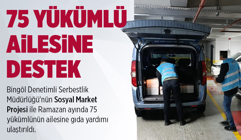 Denetimli serbestlikten yararlanan yükümlülerin topluma kazandırılması, yeniden suç işlemelerinin önlenmesi, kendilerine ve topluma faydalı bir birey olarak hayatlarına devam ederek bireysel ve toplumsal huzurun sağlanmasına katkı sağlamak amacıyla Bingöl Denetimli Serbestlik Müdürlüğü bünyesinde kurulan Sosyal Market Projesi ile Ramazan ayı süresince 75 yükümlünün ailesine gıda yardımında bulunuldu.