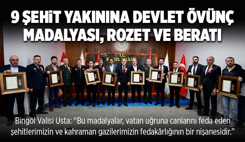 Cumhurbaşkanı Recep Tayyip Erdoğan tarafından tevcih edilen ‘Devlet Övünç Madalyası, Rozet ve Beratları' takdim edildi. Vali Usta: “Bu madalyalar, vatan uğruna canlarını feda eden şehitlerimizin ve kahraman gazilerimizin fedakârlığının bir nişanesidir. Şehitlerimizin emanetleri olan ailelerimizin her zaman yanında olacağız. Ruhları şad, makamları âli olsun!” dedi.