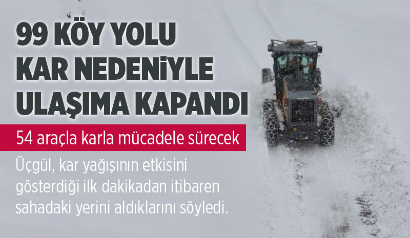 "Kısa sürede yolları yeniden ulaşıma açacağız"Üçgül; “İlimizde dün erken saatlerden itibaren kuvvetli kar yağışı etkisini gösterdi. Biz de özel idare olarak hemen reaksiyon göstererek köy yollarında çalışmalara başladık. Dün kapalı olan birçok köy yolumuzu açtık ama kar yağışı yeniden etkili oldu. Bu sabah saatleri itibariyle 99 köy yolumuz ulaşıma kapalı. Ekiplerimiz çalışmalarına devam ediyor. Kısa sürede yolları yeniden ulaşıma açacağız” dedi. Vatandaşlardan tedbirli olmasını da isteyen Üçgül; “Kuvvetli kar yağışı nedeniyle ulaşımda aksamalar meydana geliyor. Vatandaşlarımızın bu konuda tedbirli olmasını rica ediyoruz. 54 aracımızla karla mücadelemiz aralıksız sürecek” diye konuştu.
