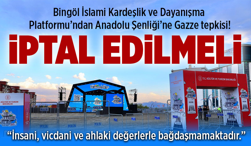 Bingöl İslami Kardeşlik ve Dayanışma Platformu, yaptığı yazılı açıklamayla İsrail'in soykırımına maruz kalan Gazze'de yaşanan insanlık dramı ve katliamlara karşın Kültür ve Turizm Bakanlığı'nca Bingöl'de düzenlenecek Anadolu Şenliği'nin iptali çağrısında bulundu.