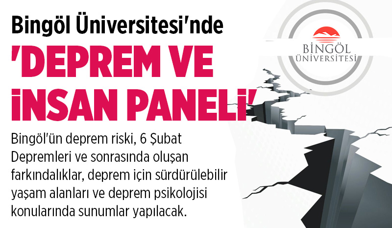 Bingöl Üniversitesi tarafından 'Deprem ve İnsan Paneli' düzenlenecek. 05 Mart 2025 Çarşamba günü saat 09.00'da Bingöl Üniversitesi Prof. Dr. Fuat Sezgin Konferans Salonu'nda düzenlenecek panelde, Bingöl'ün deprem riski, 6 Şubat Depremleri ve sonrasında oluşan farkındalıklar, deprem için sürdürülebilir yaşam alanları ve deprem psikolojisi konularında sunumlar yapılacak.