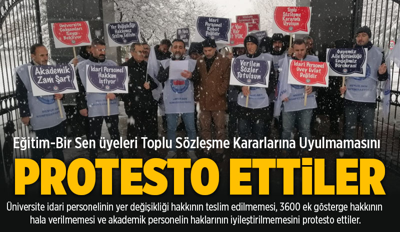 Eğitim-Bir-Sen öncülüğünde 81 ilde üniversite önlerinde yükseköğretim çalışanları sesini yükselterek bürokrasi koridorlarına sıkışan toplu sözleşme kararının bir an önce karşılık bulmasını talep etti.