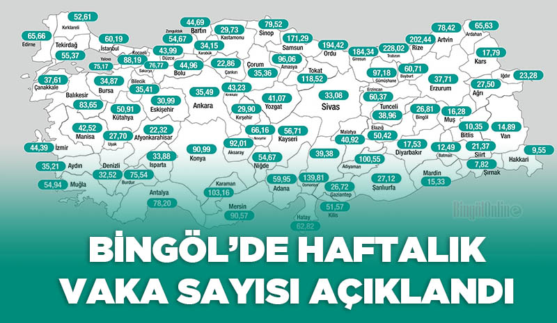 Sağlık Bakanı Fahrettin Koca, 81 ilin haftalık vaka sayını açıkladı. Verilere göre, 8-14 Şubat 2021 tarihler arasında Bingöl'deki vaka sayısı 100 Binde 26,81 kişi. Buna göre; 280 Bin nüfuslu Bingöl'de haftalık vaka sayısı yaklaşık 75 olarak görülüyor.