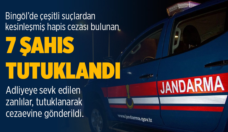 Bingöl'de jandarma ekipleri tarafından yapılan çalışmada çeşitli suçlardan kesinleşmiş hapis cezası bulunan 7 zanlı yakalandı. Adliyeye sevk edilen zanlılar tutuklanarak cezaevine gönderildi.