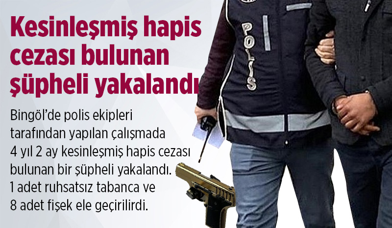 Öte yandan Bingöl Asayiş Şube Müdürlüğü Motosikletli Polis Timleri Büro Amirliği ekiplerince yapılan çalışmada 1 adet ruhsatsız tabanca ve 8 adet fişek ele geçirilirken şüpheli şahıs hakkında adli işlem başlatıldığı bildirildi.