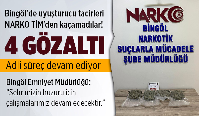 Uyuşturucuyla mücadele kapsamında çalışmalarını sürdüren Bingöl Emniyet Müdürlüğü Narkotik Suçlarla Mücadele Şube Müdürlüğüne bağlı NARKO TİM'lerin özel çalışmaları neticesinde birbiriyle bağlantılı olarak hareket eden iki ayrı araç durdurularak yapılan aramalarda 2 kilo 86 gram SKUNK maddesi ele geçirildiği bildirildi. Araçlardaki 4 şüphelinin gözaltına alındığı, sorgularının ardından Adliye'ye sevk edildiği ve adli sürecin devam ettiği bildirildi.