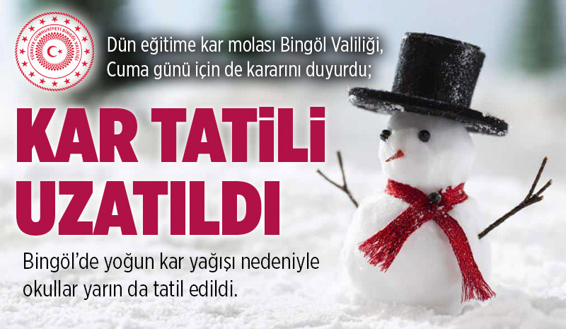 "Bingöl genelinde eğitim öğretime ara verilmesine dayanak teşkil eden olumsuz hava şartları devam etmektedir. Yaşanabilecek muhtemel olumsuz hava şartlarına bağlı olarak yoğun kar yağışı buzlanma ve ulaşımda gerçekleşebilecek tehlikelere karşı tedbir amacıyla Bingöl merkez ve ilçelerin tamamındaki her türlü resmi ve özel okullar ile özel eğitim kurumlarında 14 Şubat 2025 Cuma günü eğitim ve öğretime ara verilmesi 1 gün daha uzatılmıştır. Kamuda çalışan engelli ve hamile personelimiz de aynı gün idari izinli sayılacaktır” denildi.