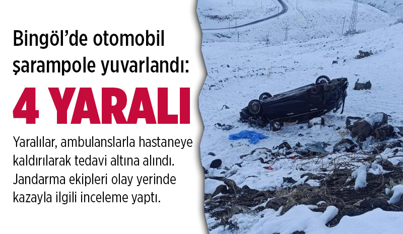 Kaza, Bingöl'ün Solhan ilçesine bağlı Hazarşah köyü Yüzenada mevkiinde meydana geldi. Edinilen bilgiye göre, kar ve buzlanmanın etkili olduğu bölgede sürücüsünün direksiyon hakimiyetini kaybettiği otomobil, şarampole yuvarlandı. Kazada, 4 kişi yaralandı. Haber verilmesi üzerine olay yerine sağlık ve jandarma ekipleri sevk edildi. Yaralılar, ambulanslarla hastaneye kaldırılarak tedavi altına alındı.