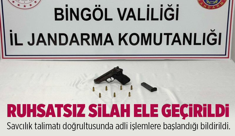 | Bingöl'de ruhsatsız silah ele geçirildiBingöl'ün Solhan ilçesinde jandarma ekiplerince düzenlenen operasyonda, 1 adet ruhsatsız silah ele geçirildi. Bingöl İl Jandarma Komutanlığına bağlı Solhan İlçe Jandarma Komutanlığı ve İstihbarat Şube Müdürlüğü ekiplerince, icra edilen devriye faaliyeti esnasında şüpheli bir araç içerisinde yapılan arama neticesinde, 1 adet tabanca, 1 adet şarjör, 7 adet fişek ele geçirildi. Olaya ilişkin 1 şüpheli şahıs hakkında 6136 sayılı Kanuna muhalefetten cumhuriyet savcısının talimatları doğrultusunda adli işlemlere başlandığı kaydedildi.
