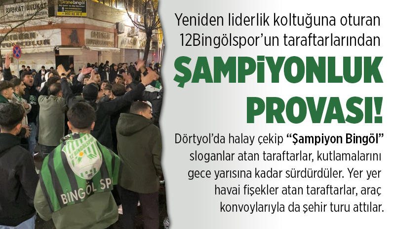TARAFTARLAR KUTLAMALARA BAŞLADILiderliği elde eden yeşil beyazlı 12Bingölspor'un taraftarları, akşam saatlerinde Dörtyol Kavşağı'nda toplandı ve yoğun yağmura rağmen davul zurna eşliğinde halaylar çekip adeta şampiyonluk kutlamalarının provasını yaptılar. “Şampiyon Bingöl” sloganlar atan taraftarlar, kutlamalarını gece yarısına kadar sürdürdüler. Yer yer havai fişekler atan taraftarlar, araç konvoylarıyla da şehir turu attılar.