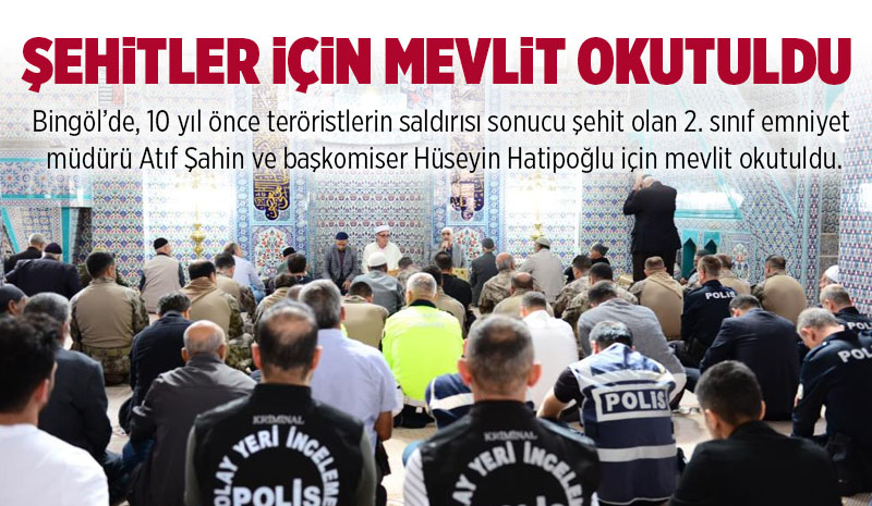 Bingöl'de şehitler için mevlit okutulduBingöl'de, 10 yıl önce teröristlerin saldırısı sonucu şehit olan 2. sınıf emniyet müdürü Atıf Şahin ve başkomiser Hüseyin Hatipoğlu için mevlit okutuldu.![]() Bingöl'de 9 Ekim 2014'te teröristlerin saldırısı sonucu 2. sınıf emniyet müdürü Atıf Şahin ve koruma ekibinden komiser Hüseyin Hatipoğlu şehit oldu. Şahin ve Hatipoğlu için şehadetlerinin yıl dönümünde Bingöl'de mevlit okutuldu. Bingöl Valisi Ahmet Hamdi Usta, İl Emniyet Müdürlüğünce Merkez Hacılar Camisinde cuma namazı öncesinde okutulan mevlit programına katıldı. Burada Şahin ve Hatipoğlu nezdinde tüm şehitlere dualar edildi. İHA