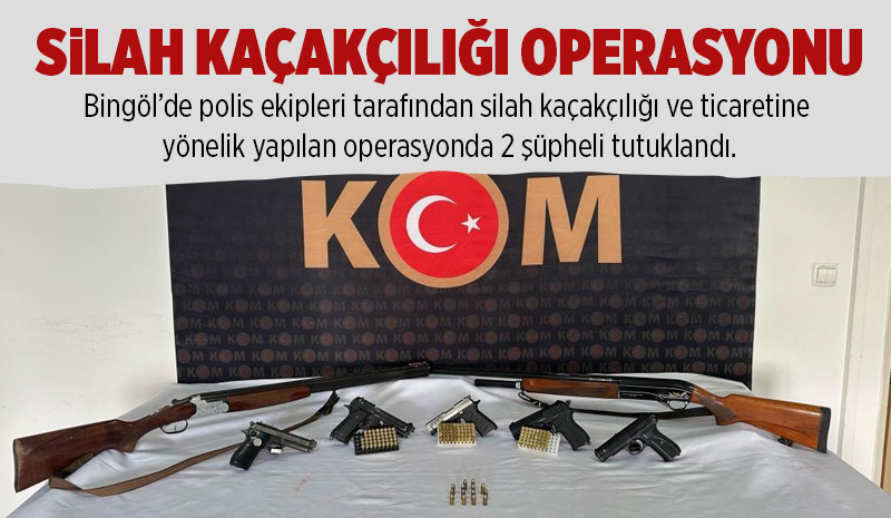 | Bingöl'de silah kaçakçılığı operasyonu: 2 tutuklamaBingöl'de polis ekipleri tarafından silah kaçakçılığı ve ticaretine yönelik yapılan operasyonda 6 şüpheli şahsa adli işlem başlatıldığı ve 2 şüphelinin tutuklandığı bildirildi. Bingöl İl Emniyet Müdürlüğü Kaçakçılık ve Organize Suçlarla Mücadele (KOM) Şube Müdürlüğü ekiplerince; silah kaçakçılığı ve ticareti suçları ile ilgili olarak yapılan operasyonda, 8 şüpheli yakalandı. Şüpheli şahıslar üzerinde yapılan aramada; 3 adet tabanca, 3 adet şarjör, 2 adet kurusıkı tabanca, 2 adet ruhsatsız av tüfeği, 147 adet fişek ele geçirildi. Operasyonda 6 şüpheli şahsa adli işlem başlatıldığı ve 2 şüphelinin tutuklandığı bildirildi.