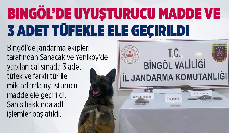 Bingöl Valiliği'nden yapılan açıklamada, "Bingöl İl Jandarma Komutanlığı ekiplerince merkez ilçe mülki sınırları içerisinde kaçak avcılık ile uyuşturucu veya uyarıcı madde imal ve ticaretinin önlenmesine yönelik yapılan istihbarı çalışmalar neticesinde, Hasanova kırsalında ormanlık arazi içerisinde kaçak av yaptıkları tespit edilen 2 şüpheli şahsa ait takozsuz olarak kullanılan 2 adet av tüfeği ele geçirilerek Doğa Koruma ve Milli Parklar personeline teslim edilmiş ve şüpheli şahıslar hakkında 4915 sayılı kanuna muhalefetten idari para cezası uygulanmıştır. Ayrıca, Yeniköy Köyü mülki sınırları içerisinde ise; bir şahsın ev ve eklentilerinde yapılan aramada; 43,38 gram Kubar Esrar maddesi, 2,22 gram toz esrar maddesi, 122,72 gram kenevir tohumu ve 1 adet ruhsatsız av tüfeği ele geçirilmiş olup, söz konusu şahıs hakkında adli işlemler başlatılmıştır” denildi.