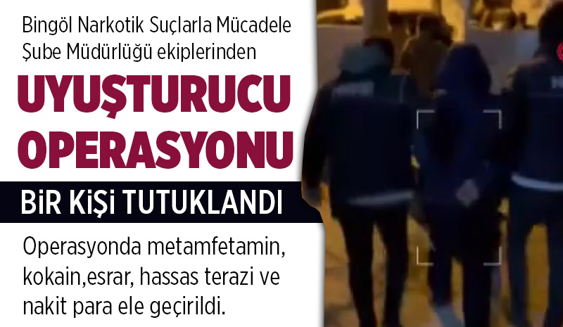 Bingöl Emniyet Müdürlüğü Narkotik Suçlarla Mücadele Şube Müdürlüğü ekiplerince Mirzan Mahallesi'nde bulunan bir ikamete operasyon gerçekleştirildi. Operasyonda 9 fişek halinde 4.25 gram metamfetamin, 1 fişek halinde 0.75 gram kokain, 1 adet içime hazır 1.55 gram esrar, 1 adet uyuşturucu madde tartımında kullanıldığı değerlendirilen hassas terazi, uyuşturucu madde ticaretinden elde edildiği değerlendirilen 10 bin 400 lira ele geçirildi.